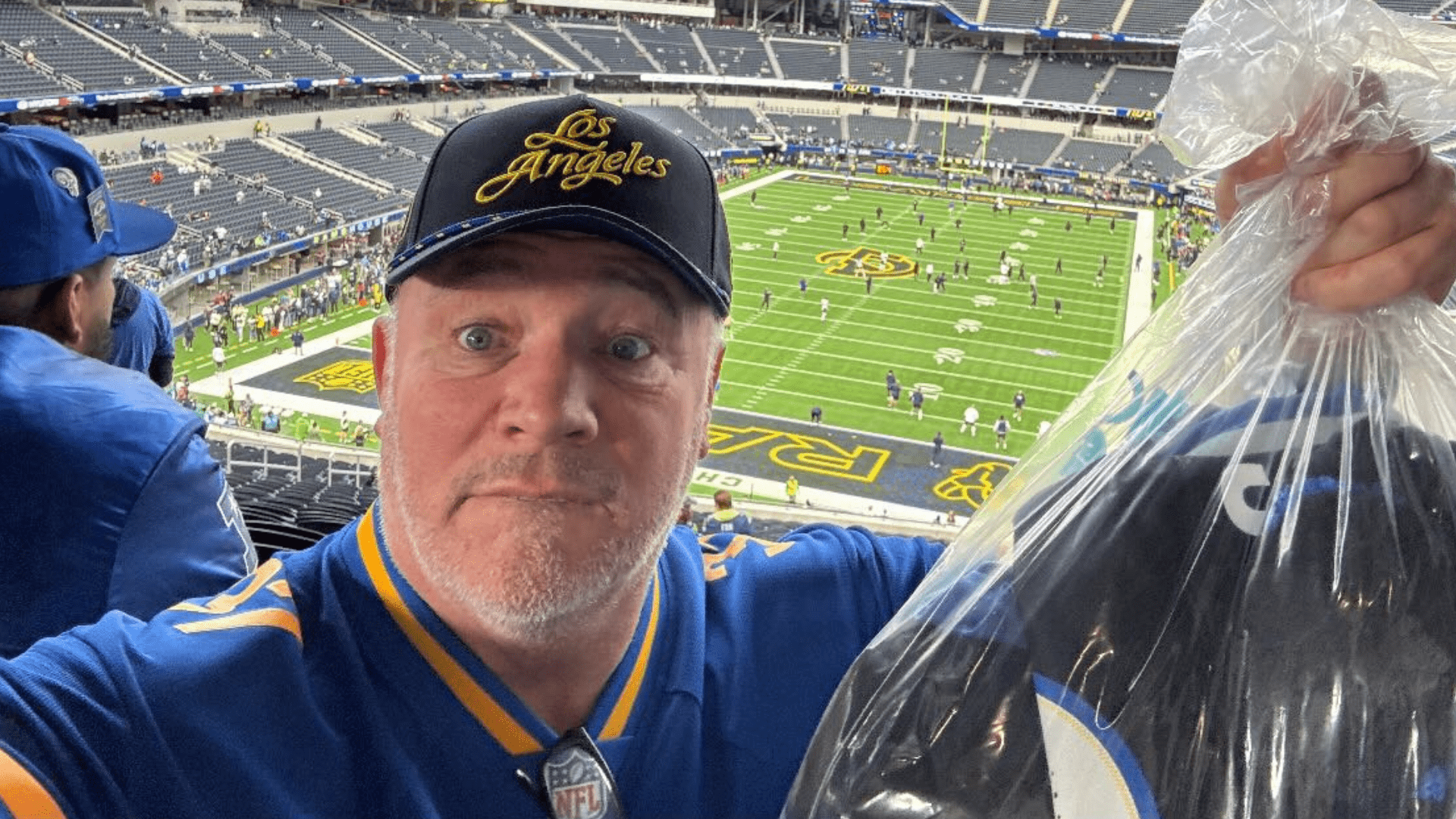 He revealed he’d “done my brains in the Rams shop”, and could be seen clad head-to-toe in LA Rams gear – hat and jersey included.