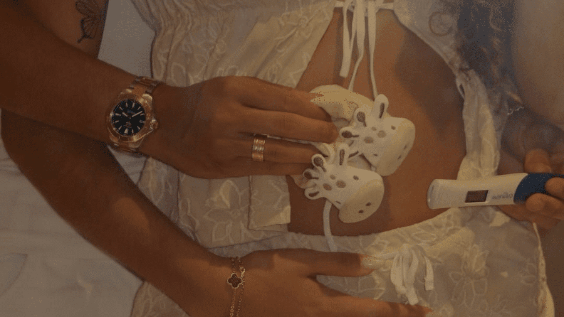 They shared a series of snaps with Gabriella cradling her baby bump with the pregnancy test also in the image.