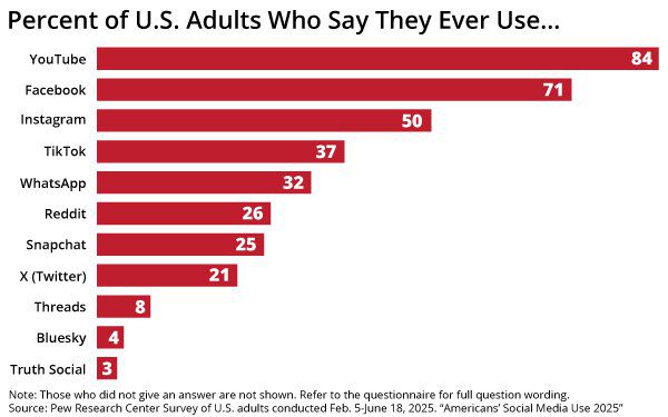This year, Pew also asked about three platforms that are used by few adults (about one in ten) — Threads, Bluesky, and Truth Social. Users under 30 years old are far