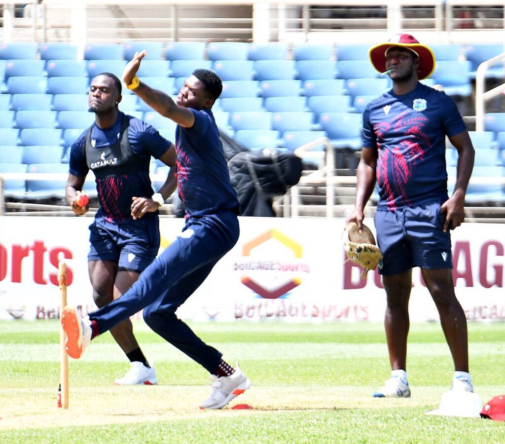 West Indies Head Coach Daren Sammy (right) watches as pace bowlers Jayden Seales (left) and Alzarri Joseph practise at Sabina Park in Kingston, Jamaica, on July