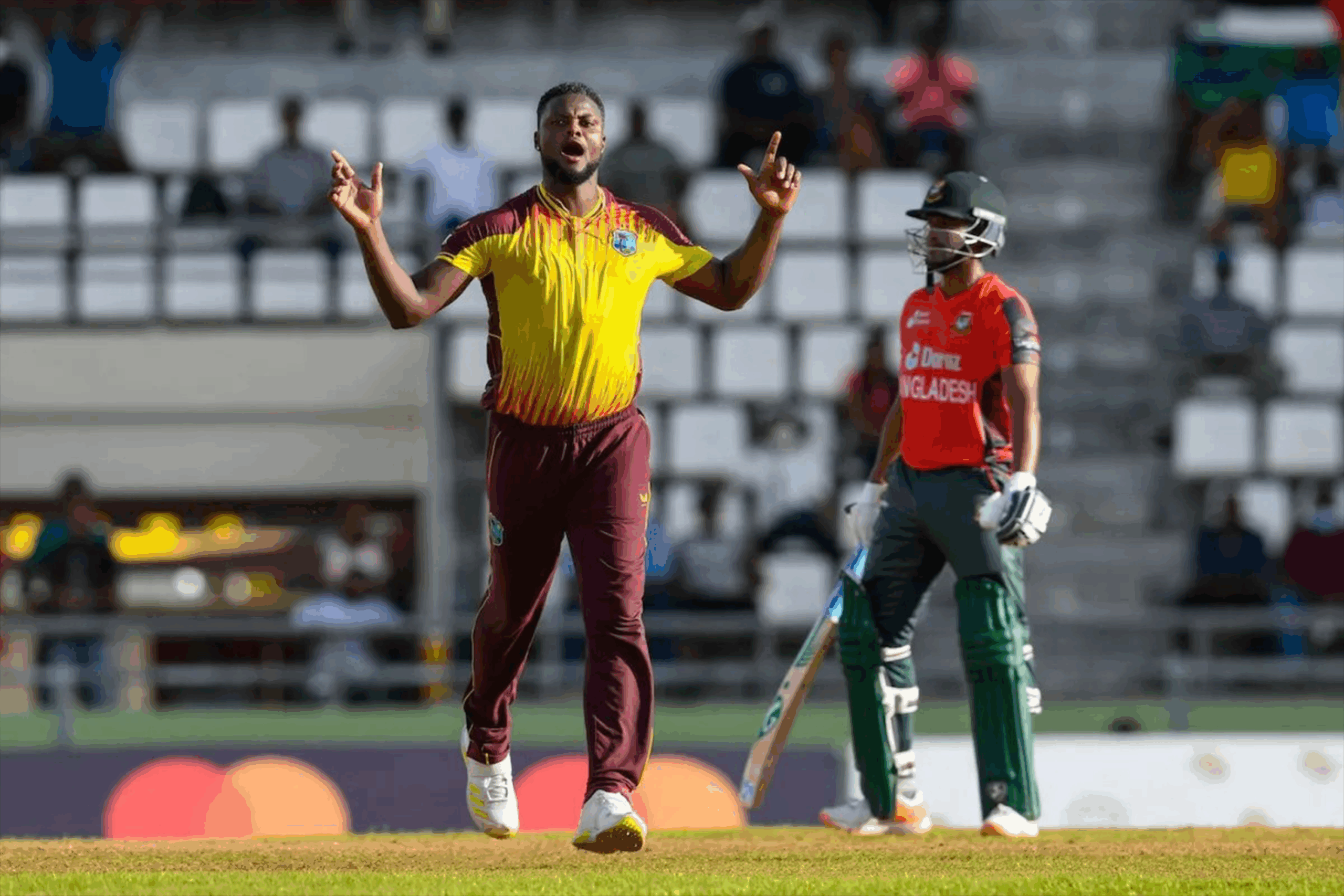 Their fielders then dropped four catches, but spectacular work from the bowling trio of Romario Shepherd — who was named Player-of-the-Match — Akeal Hosein and Jason Holder bailed them out of trouble, as they restricted Bangladesh to 135 for eight.