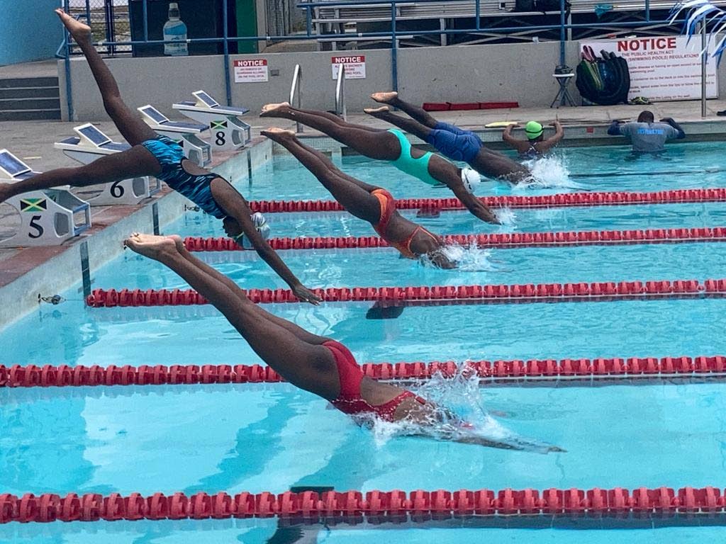 Members of Jamaica’s Carifta swim team leave the blocks during a training session at the National Aquatic Centre recently.